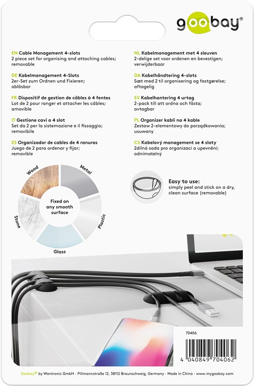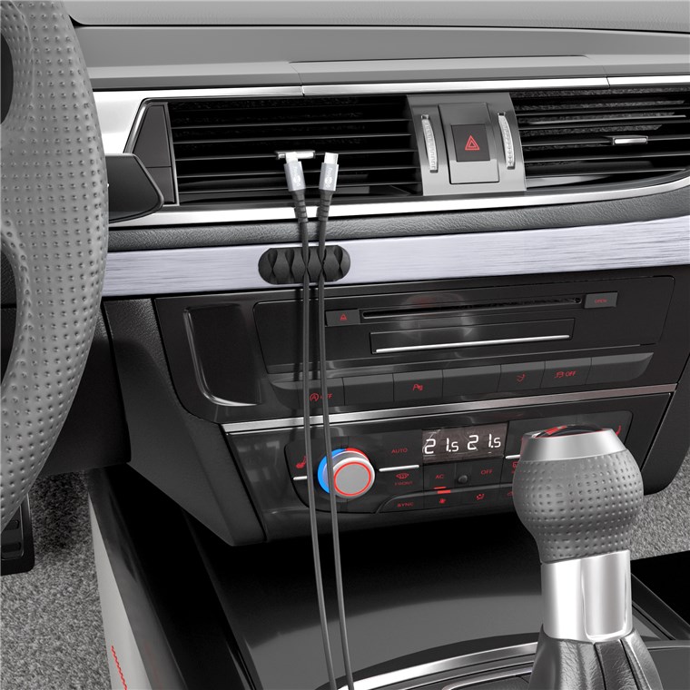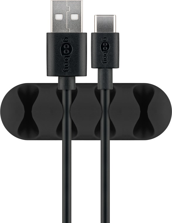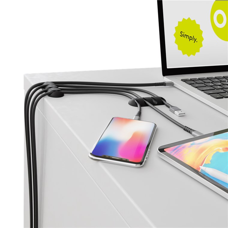 This flexible cable guide fixes cables in handle range and avoids slipping of charging cables or other USB-connections behind and under the desk. It is also perfectly usable for routing cables under the desk.