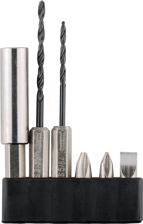 - incl.: 3 pcs. 25 mm CRV bits, 1pc. bit extension, 2 pcs. drill bits 5/64 (2 mm), 3/32 (2,5 mm) and 1 pc. power unit