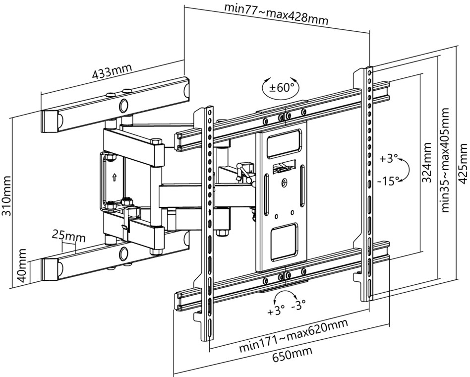 • The wallmount keeps the TV in the position with only 77mm elegantly flat and space-saving on the wall and can be extended up to 428mm to achieve the optimal viewing angle.