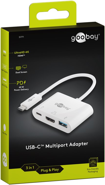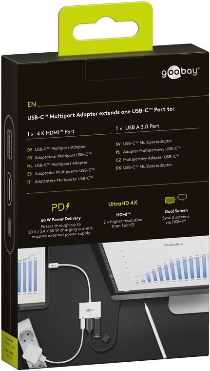 The Multiport Adapter routes signals from USB-C™ to HDMI™ and USB devices. USB Power Delivery technology enables charging of end devices with a voltage of up to 60 W. This allows for example large notebooks, hubs or docking stations to be charged easily. Additionally with USB A 3.0 socket for fast data transfer and charging with a maximum transfer rate of up to 5 Gbit/s. Resolutions up to 4K*2k@60Hz are supported.