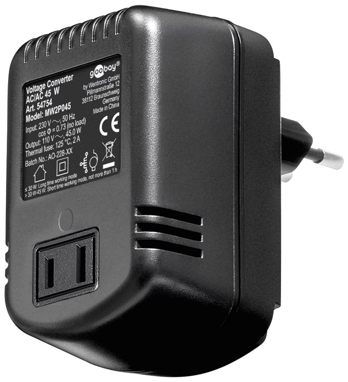 converts 220 V - 240 V AC to 110 V - 120 V AC