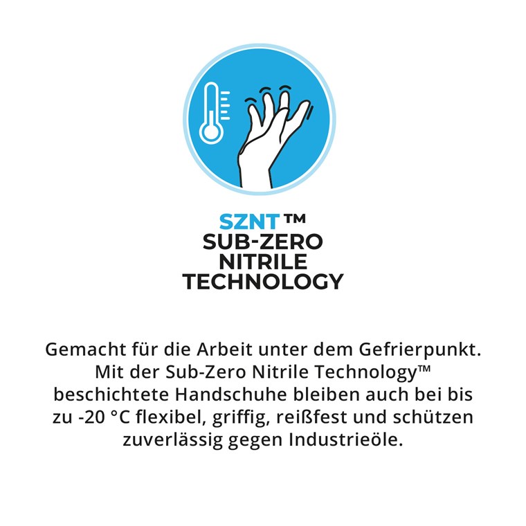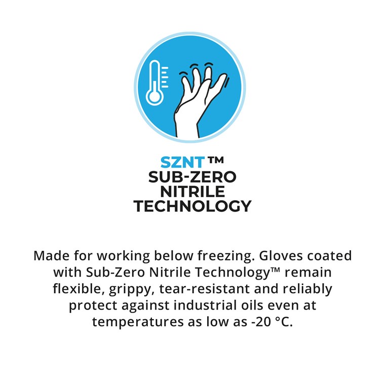 The WG-538 Freeze Flex Plus is Wonder Grips® latest innovation in cold-resistant hand protection. This is a fully double coated and cold resistant glove (contact cold performance level 2) that keeps hands warm down to -20°C. Using the specially developed and innovative SZNT™ nitrile coating, the WG-538 Freeze Flex Plus remains flexible and comfortable even in sub-freezing temperatures, while ensuring maximum abrasion resistance.